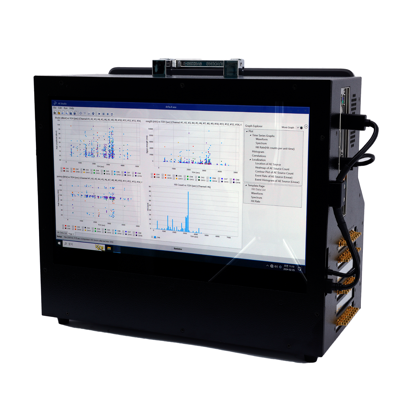 - 포터블 유닛은 AE Studio 소프트웨어를 이용하여 빠르고 쉬운 측정 옵션으로 데이터를 수집 및 분석할 수 있습니다. 채널별로 수집 설정 조건을 제어하고 데이터 수집을 시작 및 정지하는 사용자 인터페이스가 포함됩니다. 또한 AE 신호 특성 파라미터(Hit) 및 시간 도메인 파형, FFT 스펙트럼 등을 동시에 실시간으로 관측할 수 있는 시각화 기능을 지원합니다.